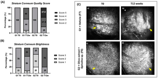 (A) Stratum corneum quality score at initial time (T0) and after 12 weeks (T12w) of the use of vehicle formulation (G1–F7) and the use of association with olive extract and Spirulina sp. formulation (G2–F6); (B) Stratum corneum brightness at initial time (T0) and after 12 weeks (T12w) of the use of vehicle formulation (G1–F7) and the use of association with olive extract and Spirulina sp. formulation (G2–F6); (C) representative Reflectance Confocal Microscopy images of Stratum corneum. The yellow arrows indicate improved stratum corneum brightness. (Scale: 500 µm × 500 µm).