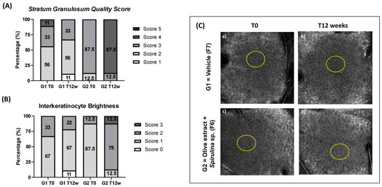 (A) Stratum granulosum Quality Score at initial time (T0) and after 12 weeks (T12w) of the use of vehicle formulation (G1–F7) and the use of association with olive extract and Spirulina sp. formulation (G2–F6); (B) Interkeratinocyte brightness at initial time (T0) and after 12 weeks (T12w) of the use of vehicle formulation (G1–F7) and the use of association with olive extract and Spirulina sp. formulation (G2–F6); (C) representative Reflectance Confocal Microscopy images of Stratum Granulosum. The yellow circles indicate improved interkeratinocyte brightness and honeycomb pattern. (Scale: 500 µm × 500 µm).