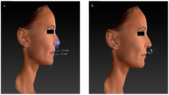 Vectra H2 allows lip protrusion and eversion determination by calculating the distance (mm) from the lips to the nasomental angle (formed from the intersection of the line of the back of the nose and the nasomental line, also known as Ricketts line) [18], as shown in Figure 4a, and the average distance (mm) between Cupid’s bow (Cb) and stomion (sto) (Figure 4b). If there is a lip size increase in terms of three-dimensionality, this can result in more significant protrusion and eversion of the lip itself. A greater protrusion can be indicated by the approach of the lip to the nasomental line, in which case a lesser distance has to be measured. Conversely, regarding eversion, the increase in the Cb-sto distance will indicate a greater torsion of the lip and thus an increase in its prominence. Still, as a further confirmation of eversion, the Upper Vermillion Height (UVH) was measured in mm. UVH is the distance (mm) from subnasale to Cupid’s bow (Sn-Cb) [19].