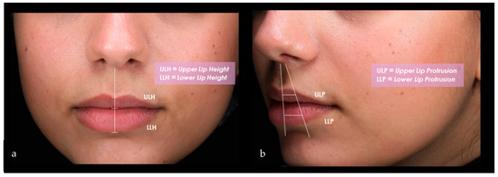 The lips are muscular–membranous skin folds that surround the mouth opening and anteriorly delimit the buccal vestibule [1]. On the face, lips occupy the lower third and play a key role in defining one’s overall aesthetic appearance [2]. Lips perform important functions, as they facilitate the articulation of words and sounds, and allow food intake; lips express one’s emotional status by conveying facial emotions, during verbal and psychological communication. Moreover, they can serve as a tactile organ, and being rich in sensory nerve endings, they are a very important erogenous zone, making them pivotal elements of human relationship life [3,4]. Lips are one of the most alluring features on the face, and thus, their dimension and youthfulness take on an important symbolic role in determining the overall perception and attractiveness of the face [5,6,7].