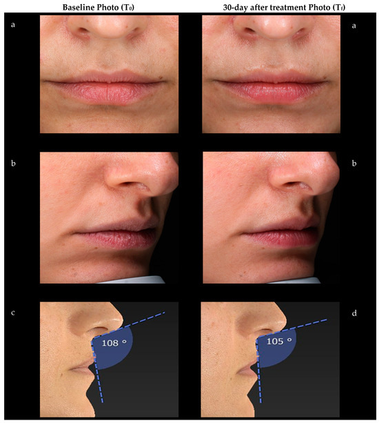 (a) Frontal and (b) lateral 2D panelist lip photos before (T0) and after 30-day treatment (Tf) with the lip plumper; (c) 3D panelist lip photos and columella angle before (T0) and (d) after 30-day treatment (Tf) with the lip plumper.