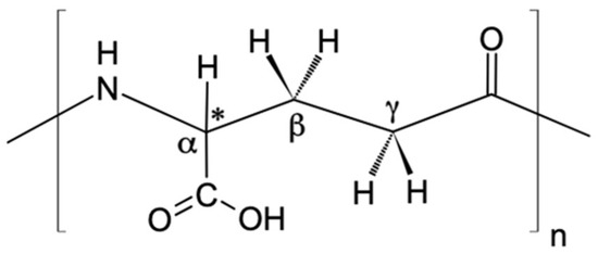 Polyglutamate, also known as poly-γ-glutamic acid (PGA), was first discovered in “natto”, a type of fermented soybean. This biopolymer is derived from glutamic acid and is characterized by its unique structure, featuring anionic natural polymer chains linking α-amino groups and γ-carboxyl groups through amide bonds (Figure 1). The molecular weight (MW) of this homo-polyamide γ-PGA ranges from 50,000 to 2 million Daltons. The polymer composition can include a homopolymer derived from either L- or D-glutamic acid, or a heteropolymer combining both L- and D- enantiomers [1,2].