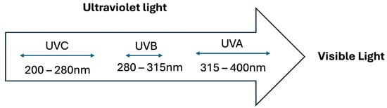 The general composition of sunlight is as follows: 44% visible light (400–780 nm), 53% infrared radiation (700–1440 nm), and 3–7% ultraviolet (UV) energy []. Ultraviolet radiation consists of three zones of different energies known as UVA, UVB, and UVC, with different impacts on human health (Figure 1). Of note, ozone has an excellent function in mitigating hazardous UVC rays that pass through the stratosphere []. Numerous positive impacts of solar radiation are present in our lives, including its crucial role in the photosynthesis of microbial algae and plants, the control of circadian rhythms, and the sensation of sight [].