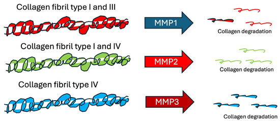 MMPs are a category of zinc- and calcium-dependent endopeptidases that degrade extracellular matrix (ECM) components such as collagen, elastin, and fibrillin-1 []. Increased MMP and decreased collagen production cause a loss of collagen content in the skin, which eventually causes wrinkle formation. MMPs are induced by severe oxidative stress and inflammatory reactions [,] and break down different types of collagen (Figure 2).