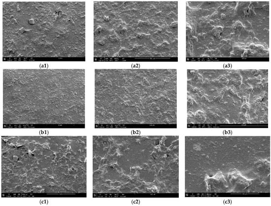 SEM images showing the surface structure of galactomannan film with and without bioactive compound incorporations. (a1–a3) 100× magnitude; (b1–b3) 250× magnitude; (c1–c3) 1000× magnitude.