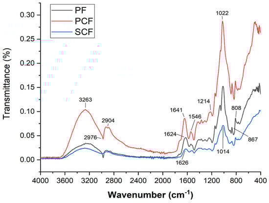 Film characterization employed Fourier-transform infrared spectroscopy (FTIR) using a Bruker FT-IR VERTEX 80/80 v spectrometer (Boston, MA, USA) in Attenuated Total Reflectance (ATR) mode, employing a platinum crystal accessory. Analyses covered the frequency range of 400 to 4000 cm−1, with 16 scans and a resolution of 4 cm−1. Before measurement, a background spectrum was obtained from a clean surface. The PF served as the reference, with spectra obtained from films containing incorporated bioactive compounds (PCF and SCF) being subtracted from the PF spectrum. Additionally, a 30 min ultraviolet radiation exposure test was conducted to assess structural changes post-sterilization.