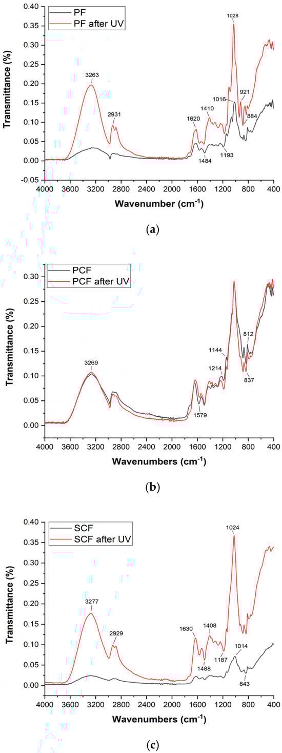 FTIR Spectra (before and after UV exposure) of the polysaccharide films (a) polysaccharide film with commercial collagenase enzyme (b) and polysaccharide film with collagenase produced using Streptomyces parvulus (c).