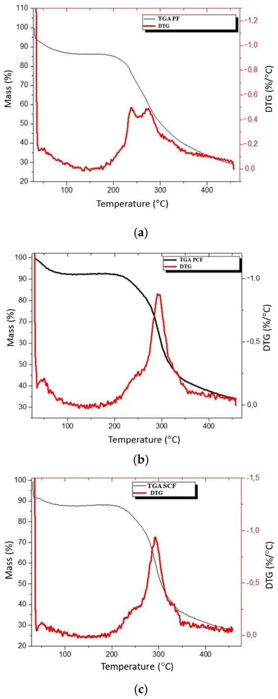 In the PF (Figure 5a), this event corresponds to a mass loss of 13%. A second event is observed with the onset around 188 °C (band at 292 °C), with a mass loss of about 60%. This event is related to the film’s decomposition process. The width of the peak in the TGA curve suggests that the decomposition process is complex. The glycerol used in the film should initiate its decomposition before the polysaccharide chain (shoulders at a temperature close to 240 °C), while the peak at 292 °C is related to the polysaccharide decomposition. In the film incorporated with commercial enzymes (PCF, Figure 5b), this initial event corresponds to a mass loss of 8%. A second event is observed starting at 185 °C (peak at 294 °C) and is related to the decomposition process of the polysaccharide chain of the film. Once again, the width of the peak suggests the occurrence of simultaneous events, with the decomposition of glycerol occurring at a lower temperature than the polysaccharide chain. The mass loss throughout the entire event is 58.5%.
