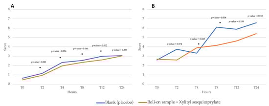Chicago/Turabian StyleMussi, Lilian, André Rolim Baby, Cecilia Nogueira, Flávio Bueno de Camargo Junior, and Wagner Vidal Magalhães. 2024. "Deodorant Efficacy of Xylityl Sesquicaprylate Vehiculated into Roll-on and Stick Prototype Formulations" Cosmetics 11, no. 3: 88. https://doi.org/10.3390/cosmetics11030088