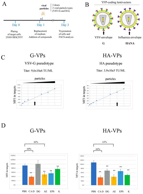 To evaluate the antiviral activity of compounds in a transduction assay, reagents were added at the given concentration into the medium of cultivated HEK293T cells plated in a 96-well plate (2.5 × 104 per dish). After 3 h of culture, diluted viral particles (40 μL) were added to obtain a final volume of 140 μL. The viral dilutions were performed in a reagent containing PBS to avoid modification of reagent concentrations in the final transduction medium. Then, 72 h later, the transduced cells were trypsinized, and the means of fluorescence (MFI) were analyzed using FACS.