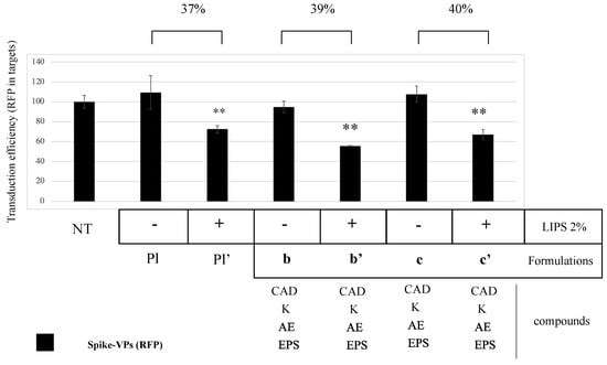 29]. At the same time, the same compounds only slightly affect the infectivity of the spike-VPs, suggesting that the SARS-CoV-2 envelope is resistant to these compounds. On the other hand, we noted that LIPS, an emulsifying agent used in cosmetic creams to create an oil–water interface on the skin and that can optimize the activity of reactive biomolecules, specifically altered the capacity of spike-VPs to infect new recipient cells after exposure to LIPS-treated skin (