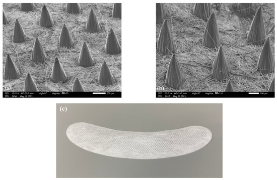 The microneedle arrays of (a) 250 μm length and (b) 350 μm length are shown in a side view of scanning electron microscope images of the pyramidal-shaped microneedle arrays situated on fabric substrates. (c) The shape of the microneedle patch.