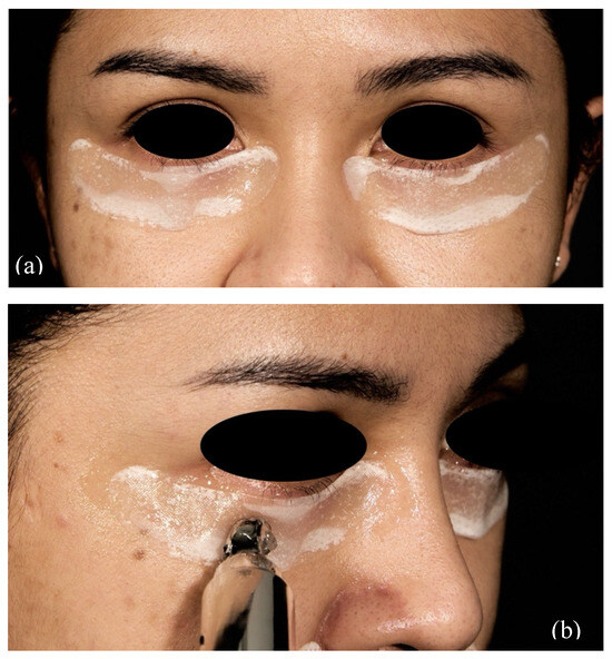 (a) Placement of microneedle patch under eyes and the cover area and (b) the use of vibrator massaging for 5 min.