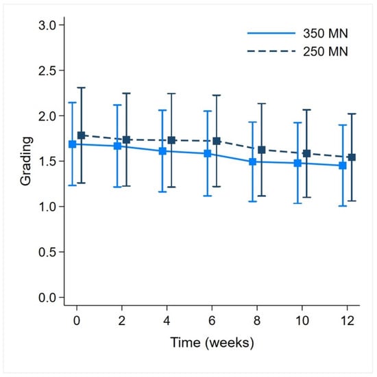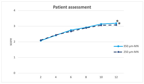 The baseline scores for both groups were 1. The improvement rates of the participants were assessed on the following scale: 0 = reduced score, 1 = no improvement, 2 = improvement of 25% to 50%, 3 = improvement of 50% to 75%, and 4 = improvement of 75% to 100%. The results suggested statistically significant improvements from weeks 2 to 12 in both treatment groups. At 12 weeks, the scores in the 350 μm MN group showed an improvement of 79% (3.19 ± 0.58/4, p-value < 0.001 *), while the improvement in the 250 μm MN group was 77% (3.08 ± 0.6/4, p-value < 0.001 *). No significant differences were recorded between the groups, as shown in Figure 9. Furthermore, looking at the patient satisfaction score, it is consistent with both subjective and objective outcomes, indicating that longer needles are slightly more effective, without statistical significance.