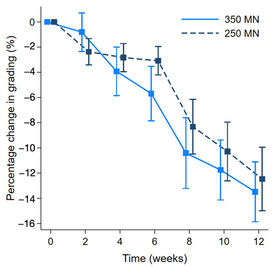 The comparison between the 350 μm MN group and the 250 μm MN group regarding the change in severity of wrinkle grade over the study period from weeks 2 to 12 revealed an average difference of −0.012, with a 95% confidence interval ranging from −0.103 to 0.08. The statistical analysis indicated no significant difference between the two groups, with a p-value of 0.805. Additionally, when examining the severity of wrinkle grade at each time point post-experiment, no statistically significant differences were observed, as shown in Table 1. From statistical calculations using percentage change comparison to clearly illustrate changes from baseline values, it is evident that the 350 μm MN group demonstrated better wrinkle reduction compared to the 250 μm MN group, with no statistical significance. The average difference in the percentage change in the severity of the wrinkle grade after the experiment from weeks 2 to 12, throughout the study period, between the 350 μm MN group and the 250 μm MN group, differed by an average of −0.39 (95% CI: −5.49, 4.71) with no statistical significance (p-value = 0.881), as shown in Table 2 and Figure 4.