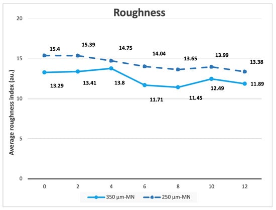 The roughness refers to the average roughness measurement recorded using an Antera3D camera (Figure 6). The baseline average roughness values were 13.29 ± 3.87 and 15.4 ± 5.49 for the 350 μm MN group and 250 μm MN group, respectively. At weeks 2, 4, 6, 8, 10, and 12, the averages were 13.41 ± 4.73, 13.8 ± 4.47, 11.71 ± 3.39, 11.45 ± 2.72, 12.49 ± 4.54, and 11.89 ± 4.42 in the 350 μm MN group and 15.39 ± 6.17, 14.75 ± 5.72, 14.04 ± 5.42, 13.65 ± 5.65, 13.99 ± 5.91, and 13.38 ± 5.15 in the 250 μm MN group, respectively. The skin roughness was slightly improved in both groups without statistical significance. The comparison of roughness in the 350 μm MN group and 250 μm MN group showed no statistically significant differences throughout the 12 weeks.