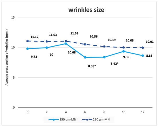 The wrinkles were objectively evaluated by comparing the 350 μm MN group and 250 μm MN group using an Antera3D camera. The overall wrinkle size refers to the average cross-section of the wrinkles in millimeters. The baseline average cross-sections of the wrinkles were 9.83 ± 3.62 mm and 11.12 ± 5.05 mm for the 350 μm MN group and 250 μm MN group, respectively. At weeks 2, 4, 6, 8, 10, and 12, the average wrinkle cross-sections were 10 ± 3.99, 10.68 ± 4.51, 8.38 ± 2.6, 8.42 ± 2.42, 9.39 ± 3.96, and 8.68 ± 3.58 mm in the 350 μm MN group and 11.03 ± 5.15, 11.09 ± 6.05, 10.56 ± 5.12, 10.19 ± 4.85, 10.03 ± 5.42, and 10.01 ± 5.01 mm in the 250 μm MN group, respectively. At the end of the study, there was an improvement in the overall size of the wrinkles on both sides but it was not statistically significant (p-values = 0.055 and 0.051). No statistically significant differences between the two groups were recorded. The details are shown in Figure 7.