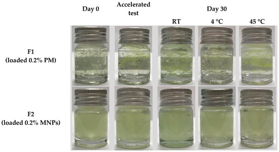 Physical appearance of formulations F1 (loaded 0.2% PM) and F2 (loaded 0.2% MNPs) before (day 0) and after stability test; accelerated and 30-day storage under various conditions (day 30). RT = room temperature.