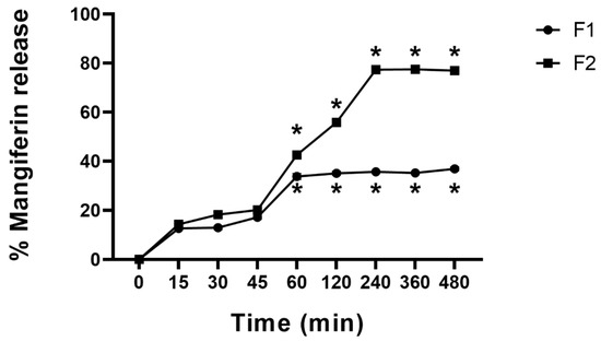 Mangiferin release profile of formulations F1 (loaded 0.2% PM) and F2 (loaded 0.2% MNPs) in PBS pH 7.4. All data are presented as mean ± SD based on three measurements (n = 3). * denotes results that significantly differ from day 0 according to t-test statistics (p < 0.05).
