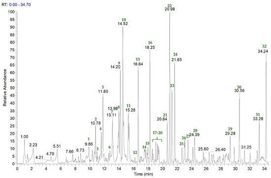 By the careful analysis of accurate masses, characteristic fragmentation patterns, and the literature data, the occurrence of 32 metabolites belonging to flavonoids (compounds 1–6, 10–12, 17, and 18), sesquiterpenoids (7–9, 13–15, 19–22, 27, and 28), amides (16, 29, and 32), polar fatty acids (23–26, 30, and 31) were tentatively identified (Figure 1, Table 1).