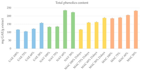 The skin is constantly exposed to reactive oxygen species (ROS) from various sources, including endogenous metabolic processes within cells and external factors such as ultraviolet (UV) radiation and air pollutants. Endogenous ROS are natural byproducts of cellular metabolism, primarily generated during mitochondrial respiration and other metabolic pathways. These molecules play essential roles in cellular signaling and homeostasis. However, excessive ROS production or insufficient antioxidant defenses can lead to oxidative stress, causing damage to cellular components, including proteins, lipids, and DNA. Extrinsic sources of ROS, such as UV radiation from sunlight and pollutants like cigarette smoke, automobile exhaust, and industrial emissions, further contribute to oxidative stress in the skin [27,28]. Polyphenols work by donating electrons to stabilize free radicals, thus preventing them from causing harm to skin cells. By neutralizing free radicals, antioxidants help to protect the skin from oxidative stress and the associated damage. So, a phenolic content assay was performed using the Folin–Ciocalteu method [14]. Regarding the mixture of solvents used, the results of the total phenolic content determination indicated a better phenolic content for the EtOH/H2O 50% and 60% extracts. By contrast, considering the extraction techniques, SLDE-Naviglio (NAV) was the best one in terms of phenolic content. Consequently, SLDE-Naviglio (NAV) extracts obtained using EtOH/H2O 50% and 60% showed GAE (milligrams of gallic acid equivalents for gram of extract) values corresponding to 223.07 and 235.07, respectively (Figure 3).