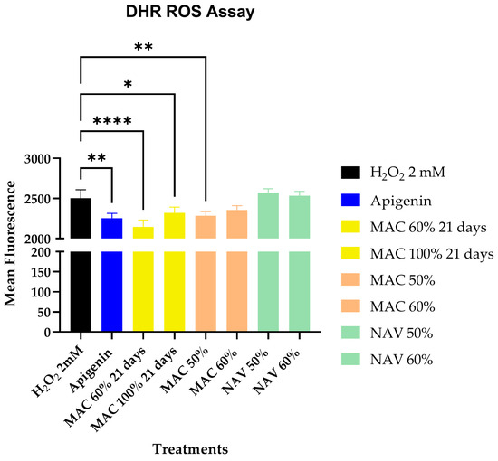 Based on the TEAC and DPPH assays, the extracts MAC 60% at 21 days, MAC 50% at 21 days, MAC 50%, MAC 60%, NAV 50%, and NAV 60% were selected to further evaluate their in vitro antioxidant activity. HaCaT cells, a spontaneously immortalized human keratinocyte line widely used for studies of skin biology [31], were used. To determine the antioxidant activity of the selected extracts and apigenin, the cell permeant reagent dihydrorhodamine 123 (DHR 123) was used for the detection of reactive oxygen species such as peroxide and peroxynitrite. Indeed, after cell uptake, DHR 123 is oxidized by ROS into a fluorescent compound measured by a fluorimeter. In our setting, the 16 h pretreatment of HaCat cells with apigenin and the extracts resulted in a lower production of DHR oxidation, following 2 h of H2O2 exposition. In detail, as shown in Figure 5, the extracts obtained by long maceration with EtOH/H2O 60% and EtOH 100% and the extract obtained by maceration with EtOH/H2O 50% displayed statistically significant activity. These data are in agreement with the TEAC and DPPH activities shown by these extracts.