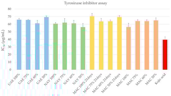 To explore the capacity of C. nobile extracts to inhibit the tyrosinase enzyme and offer potential alternatives to synthetic products commonly used in skincare, which have some safety concerns associated with long-term use [34], the tyrosinase inhibitory activity of C. nobile “green” extracts was tested by a spectrophotometric assay. Kojic acid, a known tyrosinase inhibitor, was used as a positive control (IC50 = 39.44 µg/mL ± 3.81). The obtained results (Figure 6) showed how all C. nobile extracts inhibited the tyrosinase enzyme in a range from 56.15 to 70.36 µg/mL in terms of IC50 values (Table S3). Also, the apigenin, considered a marker of chamomile, was tested. On the basis of tyrosinase inhibitory activity, all the extracts presented the potential ability to regulate melanin synthesis, providing benefits for skin health and appearance. Considering the mixture of solvents, there were no significant differences related to the percentage of ethanol used as the extraction solvent, on the contrary to what was observed for antioxidant activity. Also, the extracts EtOH/H2O 75% and EtOH 100% presented good inhibition, possibly due to the polar fatty acid content [32]. Considering the extraction technique used, however, SLDE-Naviglio turned out to be the most efficient. In particular, the extract EtOH/H2O 50% obtained by SLDE-Naviglio showed the highest inhibition of the tyrosinase enzyme (IC50 = 56.15 µg/mL ± 4.74).