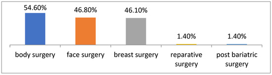 The cosmetic surgery interventions that patients were interested in were dominated by limb and figure surgery, followed by cosmetic facial surgery (Figure 9).