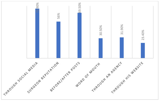 The results of the study draw attention to the fact that the patients’ interest in the surgeon’s website was exceeded by their interest and trust in the visual information, the profile agencies and especially the recommendations made by the well-known people who had gone through a surgical experience of this kind. We found a correlation between the age of patients and the choice of surgeon: 87.2% of 18–35 year olds chose their surgeon via the RS, while 79.5% of 35–50 year olds did so thanks to the RS. For those over 50, only 36.8% chose their surgeon via the RS. The difference between these age groups is significant (p = 0.0001) (Figure 11).