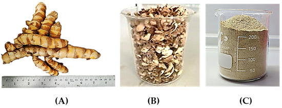 Kaempferia galanga Linn. (KG). (A) Rhizome of KG; (B) small pieces of KG rhizome; (C) finely powdered KG.