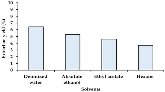 Rhizomes of Kaempferia galanga Linn (KG) were extracted using the maceration method, a conventional and cost-effective technique. Four solvents with different polarities, namely, deionized water, absolute ethanol, ethyl acetate, and hexane, were employed to extract diverse bioactive compounds from the KG rhizome. Indeed, the selection of the extraction solvent plays a crucial role in separating a desired chemical substance from herbal materials. The impact of solvent polarity on extraction yield is illustrated in Figure 2. The highest extraction yield was observed with deionized water (6.43%), followed by absolute ethanol (5.30%), ethyl acetate (4.62%), and hexane (3.68%), respectively. The results indicated that extraction yield increases as solvent polarity increases. Likewise, previous studies reported that the polarity of the extraction solvent significantly affected the extraction yield [20,21,22].