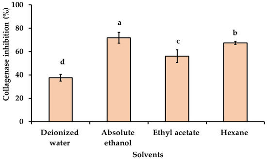 Collagenase inhibitory activity of KG extracts obtained with solvents of different polarities. The final concentration of the tested samples was 0.5 mg/mL. The values are expressed as the mean ± SD in triplicate experiments. Different alphabet letters indicate a statistically significant difference between solvents (p < 0.05).