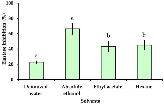 Elastase inhibitory activity of KG extracts obtained with solvents of different polarities. The final concentration of the tested samples was 0.5 mg/mL. The values are expressed as the mean ± SD in triplicate experiments. Different alphabet letters indicate a statistically significant difference between solvents (p < 0.05).
