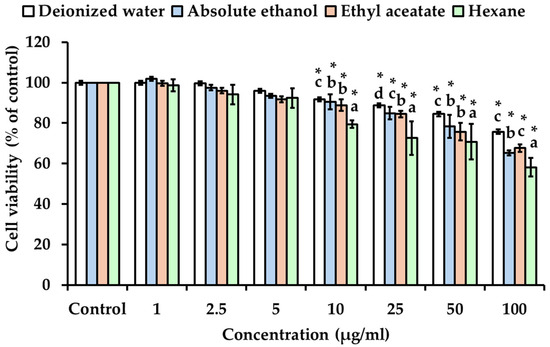 The cytotoxicity of KG extracts obtained with solvents of different polarity on human fibroblast cells (WS-1). The values are expressed as the mean ± SD in triplicate experiments. The asterisk mark (*) indicates a statistically significant difference at p < 0.05 compared to the control group. Different alphabet letters indicate a statistically significant difference at p < 0.05 among the different solvents.