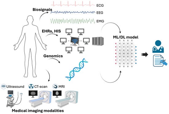 Artificial intelligence (AI) is rapidly gaining prominence in modern healthcare, significantly altering various medical practice fields, including diagnosis, treatment, and broader applications []. Using advanced machine learning algorithms and deep learning to analyze extensive datasets, including patient electronic health records (EHRs) [,], medical imaging [,], genomic sequences [,], and real-time physiological data streams (electrocardiograms, electroencephalograms, and electromyograms) [,,]. In diagnostic tasks, AI demonstrates exceptional proficiency in interpreting complex medical images, aiding radiologists and pathologists in the early detection and categorization such as cancers, vascular diseases, neurological disorders, and other diseases [,,,]. Moreover, AI facilitates personalized medicine by integrating patient-specific clinical and genetic data to customize treatment strategies, predict treatment responses, and optimize therapeutic outcomes, thereby revolutionizing traditional approaches to healthcare [,,,,]. Additionally, AI technologies streamline healthcare operations by automating administrative tasks, optimizing resource allocation, and improving patient care coordination. Furthermore, AI-driven telemedicine platforms and remote monitoring tools empower patients and healthcare providers by providing real-time access to medical expertise, enabling remote consultations, continuous patient monitoring, and proactive disease management, which are particularly beneficial in remote or underserved areas [,].