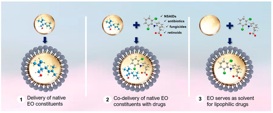 Essential oils (EOs) are complex mixtures of lipophilic, volatile compounds derived from the roots, stems, leaves, flowers, fruits, and seeds of plants [1]. They have been utilized across diverse industries, including food and beverage (35%), cosmetics, fragrances, and aromatherapy (29%), household (16%), and pharmaceutical (15%) [2]. Aligned with contemporary consumption trends and market preferences, EOs are increasingly favored as green alternatives to synthetic chemicals due to their superior eco-sustainability and safety profiles [1]. In 2022, the global EOs market was valued at USD 10.5 billion, with projections indicating growth to USD 27.5 billion by 2032; this could be driven by the continuous expansion of the cosmeceutical industry, specifically in managing dermatological conditions, such as acne, burn, and eczema [3]. To date, up to 3000 EOs have been extracted, with 300 of them being commercially significant [4]. In terms of administration, EOs can be delivered via topical or transdermal, oral, and pulmonary routes [5,6,7]. Notably, 90% of EOs are administered via topical or transdermal routes, primarily due to their non-invasive nature, lower incidence of adverse events, and higher patient compliance [5]. However, the topical application of EOs is confronted with challenges due to their high volatility, low chemical stability, poor water solubility, and skin permeability, thereby diminishing the bioavailability of EOs at their intended sites of action [8]. Additionally, the direct application of pure EOs onto the skin, especially in high concentrations, could result in irritating effects such as allergic contact dermatitis and phytophotodermatitis [9].