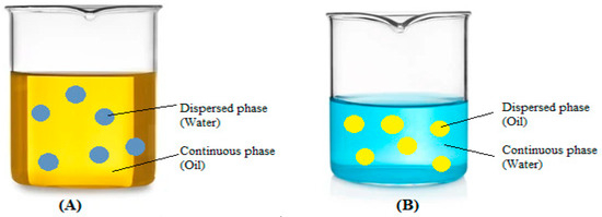 Continuous and dispersed phases in (A) W/O emulsion and (B) O/W emulsion.