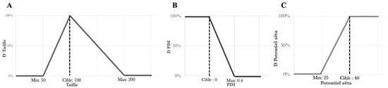 Responses for the desirability function approach. (A) Desirability for particle size (nm); (B) Desirability for PDI; (C) Desirability for zeta potential (mV).