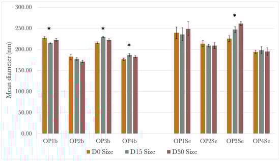 Mean PS distribution of blank (b) and sesamol (Se)-loaded optimized SLNs at different times (D-0, D-15, and D-30). * Significant difference in PS during storage (p < 0.05) (n = 3).