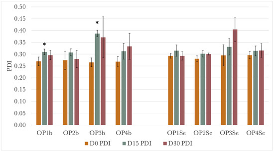 As previously mentioned, when the PDI is below 0.3, it indicates a narrow particle size distribution. Upon examination of the different formulations, it became apparent that only OP1b and OP3b SLNs exhibited a significant variation in PDI, which probably points towards an additional indicator of instability (in addition to size variation) (Figure 4).