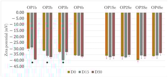 Sesamol encapsulation leads to stabilization of the particle size and PDI. This phenomenon was visible for OP1Se and OP3Se. In this last case, OP3Se was the only one exhibiting a PDI > 0.4 during storage without a significant variation. An increase or a variation in PDI indicates that the nanoparticle distribution is becoming progressively more dispersed, reinforcing the risk of instability (such as flocculation, Oswald ripening, and sedimentation).