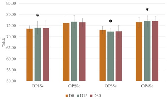 The encapsulation efficiency percentages remained consistently high across all formulations (72–77%) even after a 30-day storage period (Figure 6). The incorporation of sesamol proved to be effective and remained unchanged for OP2Se throughout the storage duration (p > 0.05). The worst case, with a release of sesamol close to 1%, was observed for OP3Se.