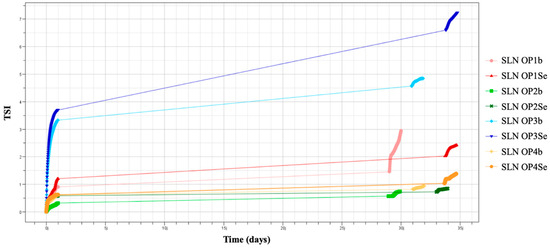In our case, the OP3b and OP3Se SLNs (in light blue and dark blue, respectively) were clearly not stable. The TSI value was above 3 after 1 day of analysis and increased with time, especially for the SLNs containing sesamol (Figure 7). Moreover, the percentage of variation of the delta retrodiffusion was around 5% for both formulations, which is also a sign of instability.