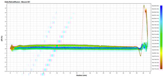 The same conclusion can be made for the OP1b and OP1Se SLNs, although the TSIs were between 1 and 3. It is important to note that for the OP1b SLNs, the TSI continued to increase sharply after 1 month of analysis, which is a sign that destabilization was still not over. Indeed, in addition to a high TSI, an increase in the percentage of backscattering can be observed at the top of the glass container around 9% (Figure 8), which could be a sign of creaming even though it was not visible to the naked eye.