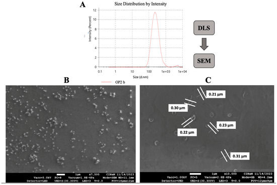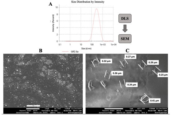 Figure 10 and Figure 11 show images of the OP2b and OP2Se SLNs, respectively. Most of the particles present a spherical shape, but we can see that this is not always the case. Moreover, the sizes of the SLNs observed by SEM (250 ± 50 nm for OP2b) were shown to be slightly bigger than those obtained by DLS (182.77 ± 6.07 nm). These phenomena can be explained by the lipid deformation that took place during the drying process of the sample. In addition, the particle shape also depends on the purity of the lipid [3,30]. On the other hand, the SEM confirmed the increase in size between the OP2b and OP2Se SLNs (Figure 10B,C and Figure 11B,C) also observed in DLS (Table 4).