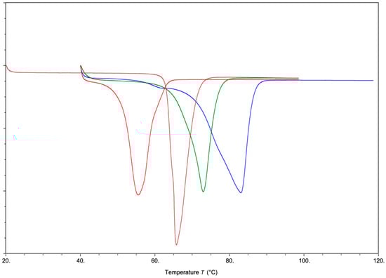 Lipid crystallization is an important point for the performance of SLN carriers. In fact, less perfect crystals with many imperfections can offer space to accommodate the drug [2] and may also modulate the mobility of the drug during the release process. As illustrated in Figure 12, the following samples are analyzed: pure GDS (red), GB (green), CW (blue), and sesamol (brown); in Figure 13, the results for unloaded (blue) and loaded (green) OP2 SLNs can be seen. In Figure 12, a sharp endothermic peak can be observed at around 65–72 °C, which represents the temperature range corresponding to the melting point of sesamol. No such peak was observed in the case of SLNs OP2Se (Figure 13).