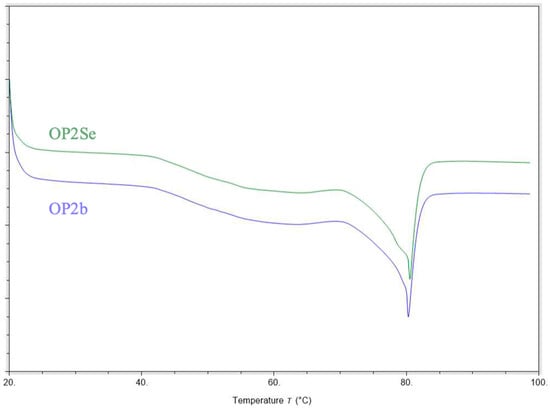 DSC thermographs of unloaded (OP2b) and loaded (OP2Se) solid lipid nanoparticles (loaded with 0.2% sesamol and obtained after 10 min of sonication).