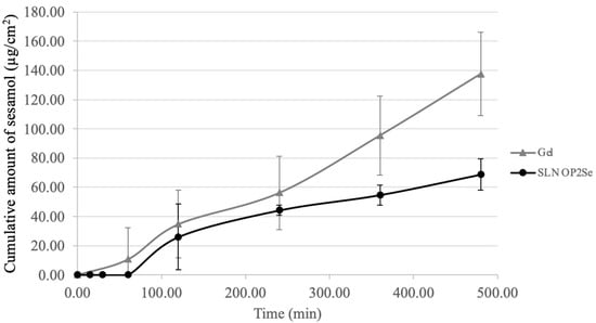 The amount of sesamol permeated through the skin using the hydrogel and OP2Se SLNs was 137.50 and 68.66 µg/cm2, respectively, after 8 h of permeation.
