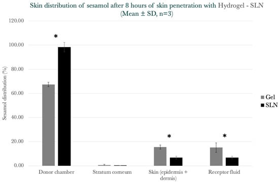 With the use of the SLN system, a significant decrease in sesamol penetration into the receptor compartment could be observed after 8 h of skin penetration. Indeed, Student’s t-test was applied to the kinetic profiles and a p-value < 0.05 was determined. Hence, this system can be useful for cosmetic applications, and careful selection of the SLN wax composition could lead to the desired approach providing active ingredient levels in specific layers of the skin [31].