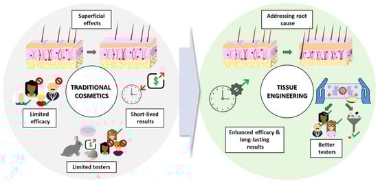 Limitations of traditional cosmetic approaches and the promise of tissue engineering. Source of some vectors: https://scidraw.io/ (accessed on 17 June 2024).